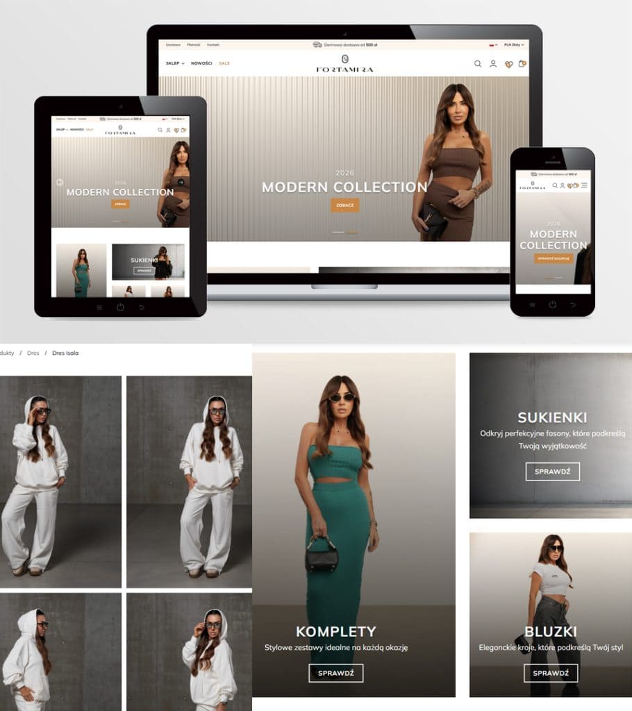 FORTAMIRA to nowoczesny i w pełni responsywny sklep internetowy zaprojektowany z myślą o wygodzie zakupów na każdym urządzeniu – od komputerów stacjonarnych po smartfony. Platforma oferuje przejrzystą nawigację, intuicyjny system kategorii produktów oraz szybko ładujące się strony, co pozytywnie wpływa na komfort użytkownika. Projekt uwzględnia najnowsze standardy e-commerce, pozwalając na łatwe przeglądanie kolekcji, filtrowanie produktów oraz sprawne finalizowanie zakupów.