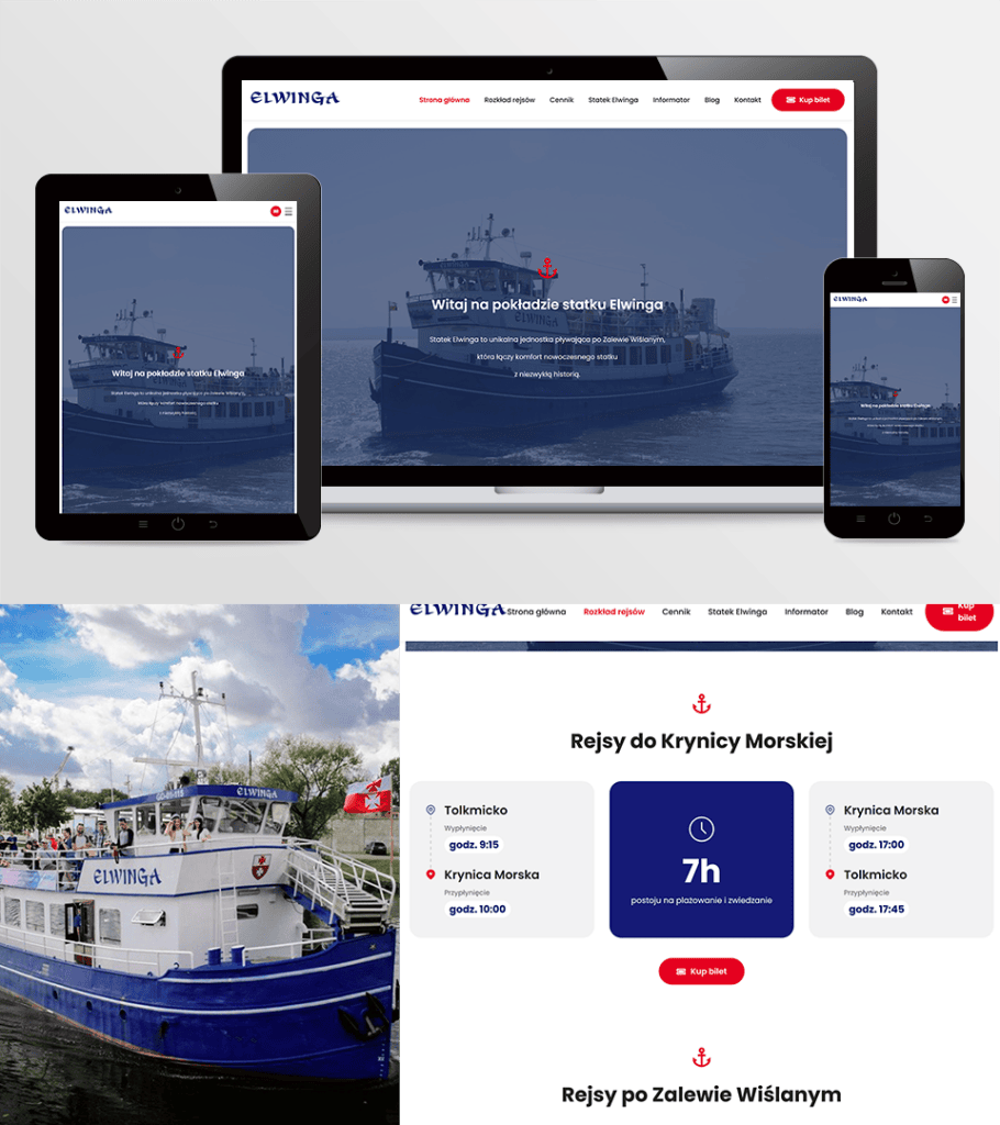 Elwinga to nowoczesna, atrakcyjna wizualnie a zarazem funkcjonalna strona www. Projekt skupia się na atrakcyjnej prezentacji treści, wykorzystując duże zdjęcia, przejrzyste sekcje informacyjne oraz czytelną strukturę podstron. Witryna została przygotowana w technologii RWD, dzięki czemu zapewnia wygodne przeglądanie na różnych urządzeniach, a zastosowane rozwiązania umożliwiają łatwą aktualizację informacji o rejsach, wydarzeniach oraz ofercie dla pasażerów.