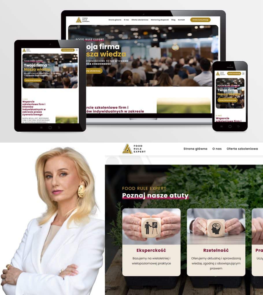 Strona FOOD RULE EXPERT została zaprojektowana z myślą o pozytywnym doświadczeniu użytkownika. Intuicyjna nawigacja, czytelny układ treści i wyróżniające grafiki zapewniają komfort przeglądania, a pełna responsywność sprawia, że witryna działa płynnie na wszystkich urządzeniach. Projekt skupia się na estetyce i funkcjonalności, wspierając użytkowników w szybkim znalezieniu potrzebnych informacji i rejestracji na szkolenia.