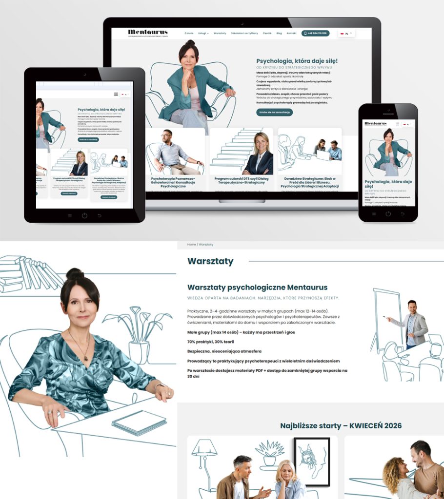 Funkcjonalna i responsywna strona www Mentaurus koncentruje się na budowaniu autorytetu, poprzez przemyślaną architekturę informacji, wyważoną typografię oraz subtelne interakcje użytkownika. Zastosowano dedykowane sekcje usługowe, rozbudowaną strukturę treści oraz elementy wspierające prezentację autorskiego programu, co pozwala na klarowne komunikowanie wartości i specjalizacji marki.