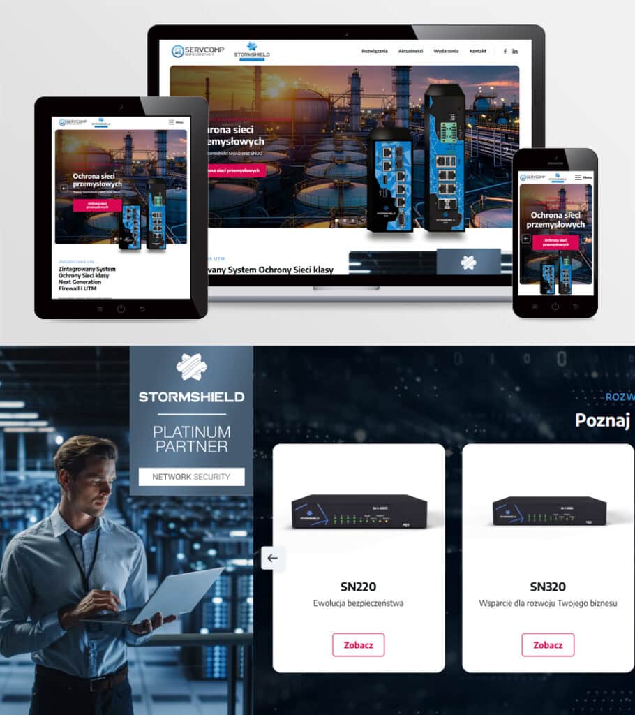 Strona SERVCOMP – Stormshield została zaprojektowana z myślą o prezentacji zaawansowanych rozwiązań bezpieczeństwa sieciowego klasy UTM i Next Gen Firewall. Serwis wyróżnia się czytelną strukturą, prostym interfejsem oraz intuicyjną nawigacją, co pozwala użytkownikom łatwo znaleźć informacje o funkcjonalnościach systemu IPS, monitoringu w czasie rzeczywistym oraz zarządzaniu logami i raportami. Dzięki zastosowaniu nowoczesnych technologii webowych strona działa płynnie, zapewniając szybki dostęp do dokumentacji i wsparcia technicznego.
